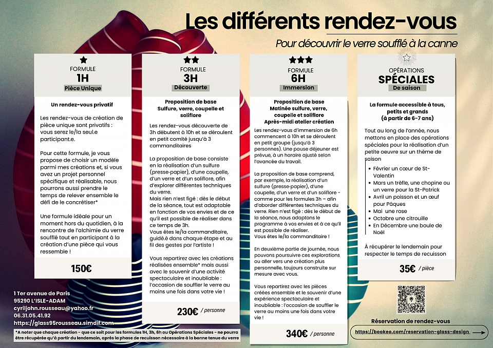 Les rendez-vous à l'atelier 1 h, 3 h et 6 h (verre soufflé à la canne)